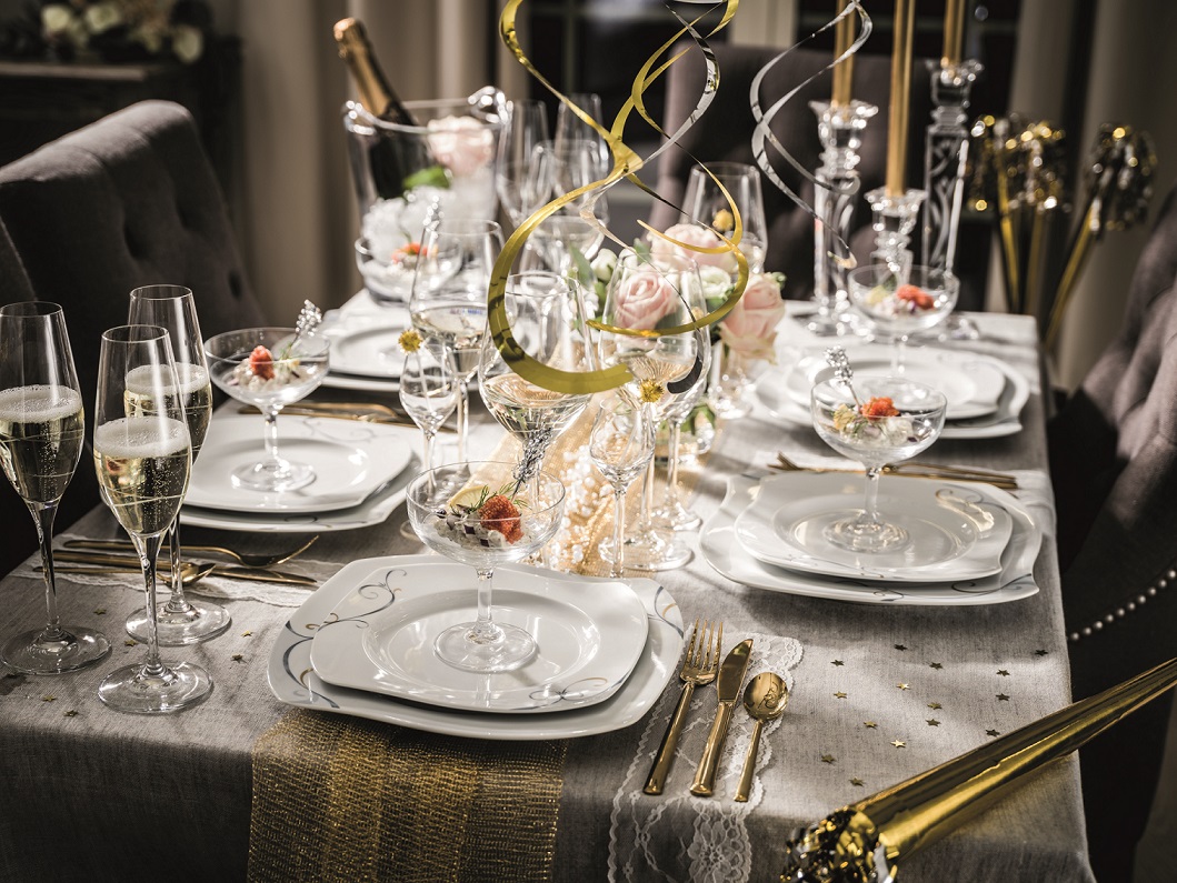 Porcelana VICTORIA Fyrklövern stanowi kwintesencję luksusu, nieodzownego przy szczególnych okazjach. A takich przecież w karnawale nie brakuje! Kolekcji VICTORIA Fyrklövern warto zapewnić towarzystwo złota, brokatu i różu. Dla tak bogatych dekoracji najlepszym tłem będzie szary, lniany obrus. Gdy rozłożymy na nim złoty bieżnik, nabierze on zupełnie nowego charakteru. Efektu dopełnią girlandy, rozrzucone błyszczące gwiazdki, kawałki koronki, użyte jako podkładka pod sztućce oraz niskie wazony, wypełnione białymi różami. Pozostaje czekać na gości i wspólnie wznieść toast za pomyślność. To będzie niezapomniane przyjęcie!