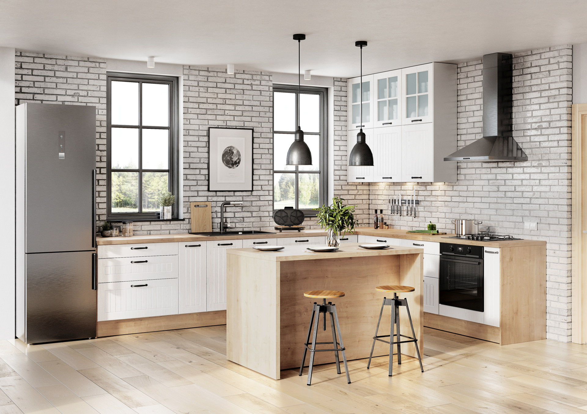 Wielkość oraz kształt kuchni będą determinowały układ zabudowy meblowej, a więc również wyspy kuchennej i miejsce jej usytuowania. Ergonomicznie zaaranżowane wnętrze powinno umożliwiać pracę w komfortowych warunkach, a jednym z nich jest odpowiednia ilość przestrzeni do wykonywania codziennych czynności. Wyspa musi być w takiej odległości od pozostałych mebli, abyśmy mogli swobodnie poruszać się w ciągu roboczym, ale również bezkolizyjnie otworzyć fronty szafek czy uchylić drzwiczki piekarnika albo lodówki.